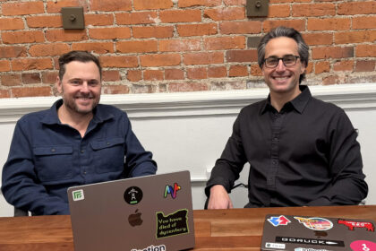 GeekWire co-founders Todd Bishop, left, and John Cook on Sound Transit’s 2…