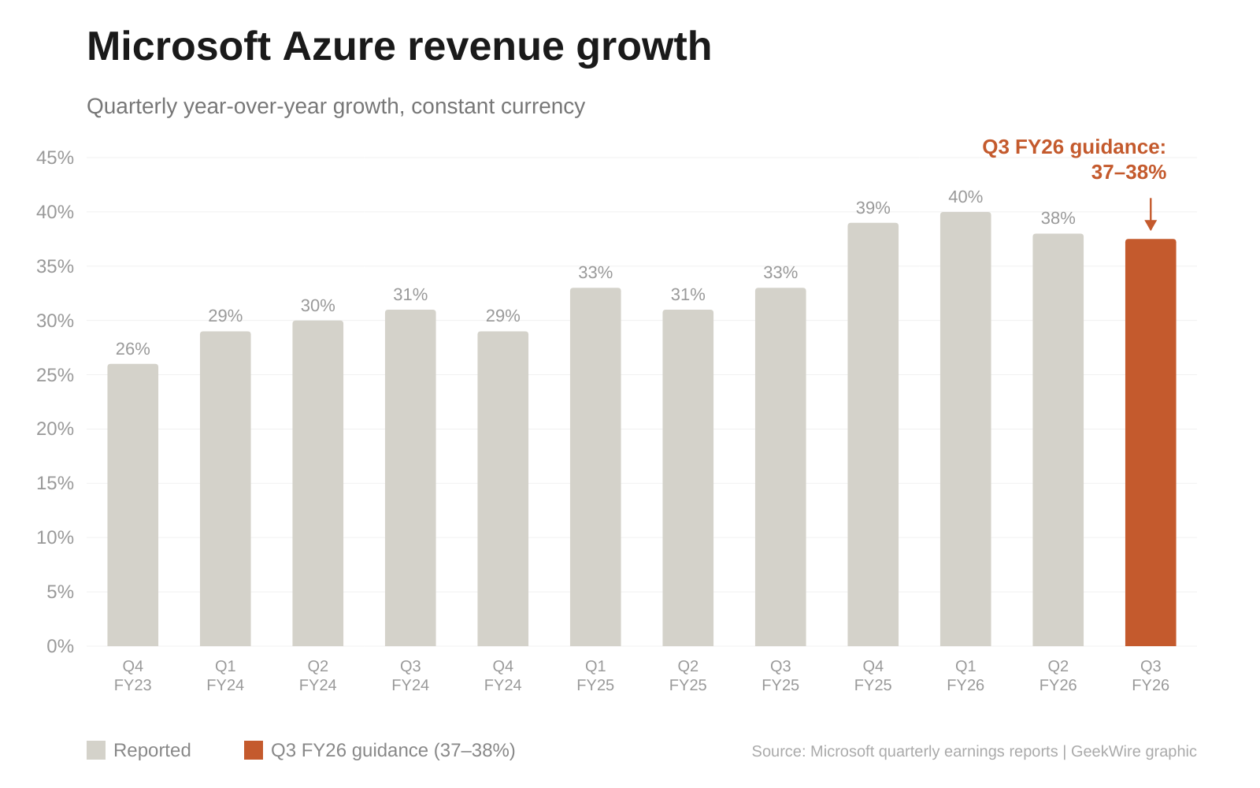 Cloud expectations: Microsoft has said it expects Azure to grow 37% to 38% in constant currency (adjusted for fluctuations in exchange rates) in Q3. That would be a slight slowdown from the 38% it posted in Q2. Last time, Azure beat Microsoft’s own forecast but fell short of what analysts were privately expecting, a major factor in the historic stock plunge.