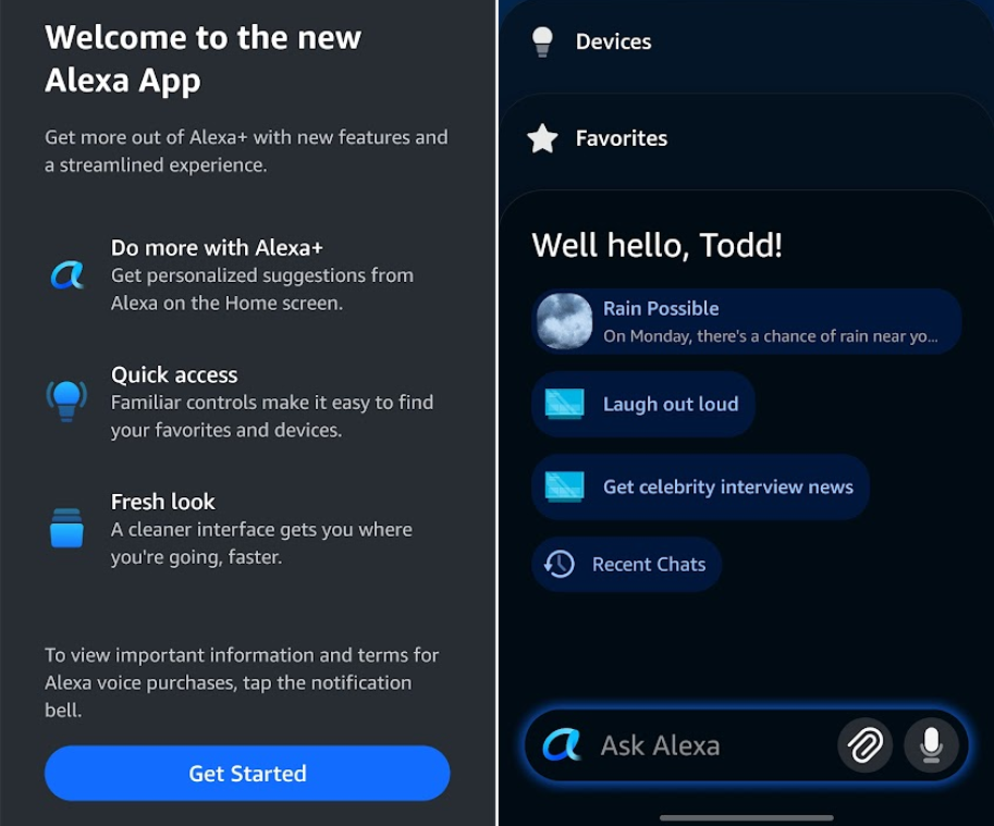 New this morning, Amazon released a streamlined Alexa mobile app that makes the AI assistant the primary focus. The redesigned interface features an “Ask Alexa” prompt anchored at the bottom of the screen, personalized suggestions, and quick access to devices and favorites — a cleaner look that prioritizes the AI assistant over other features.
