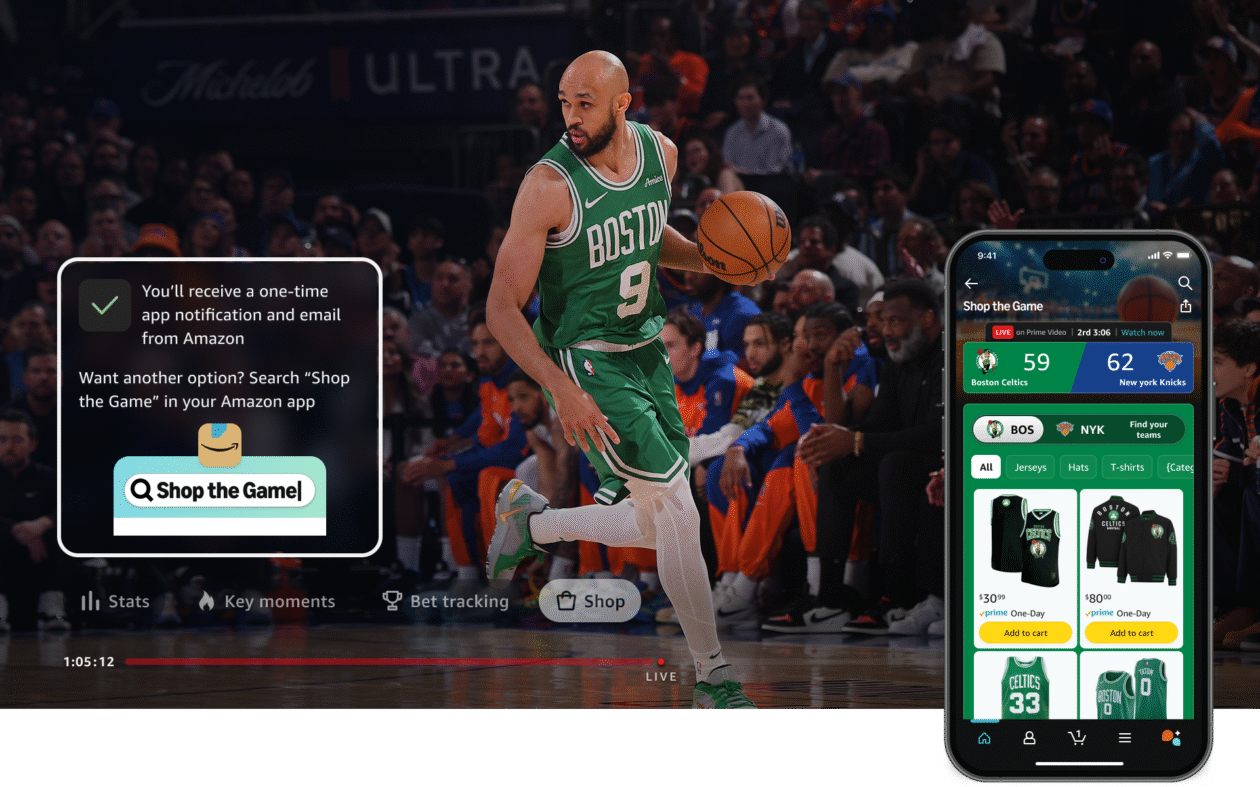 Shop the Game gives viewers access NBA fashion items and deals without leaving the action. Viewers can search “shop the game” in the Amazon Shopping app, or use their remote’s “up” button while watching NBA on Prime to reveal an interactive Shop tab that sends notifications to their mobile device.
