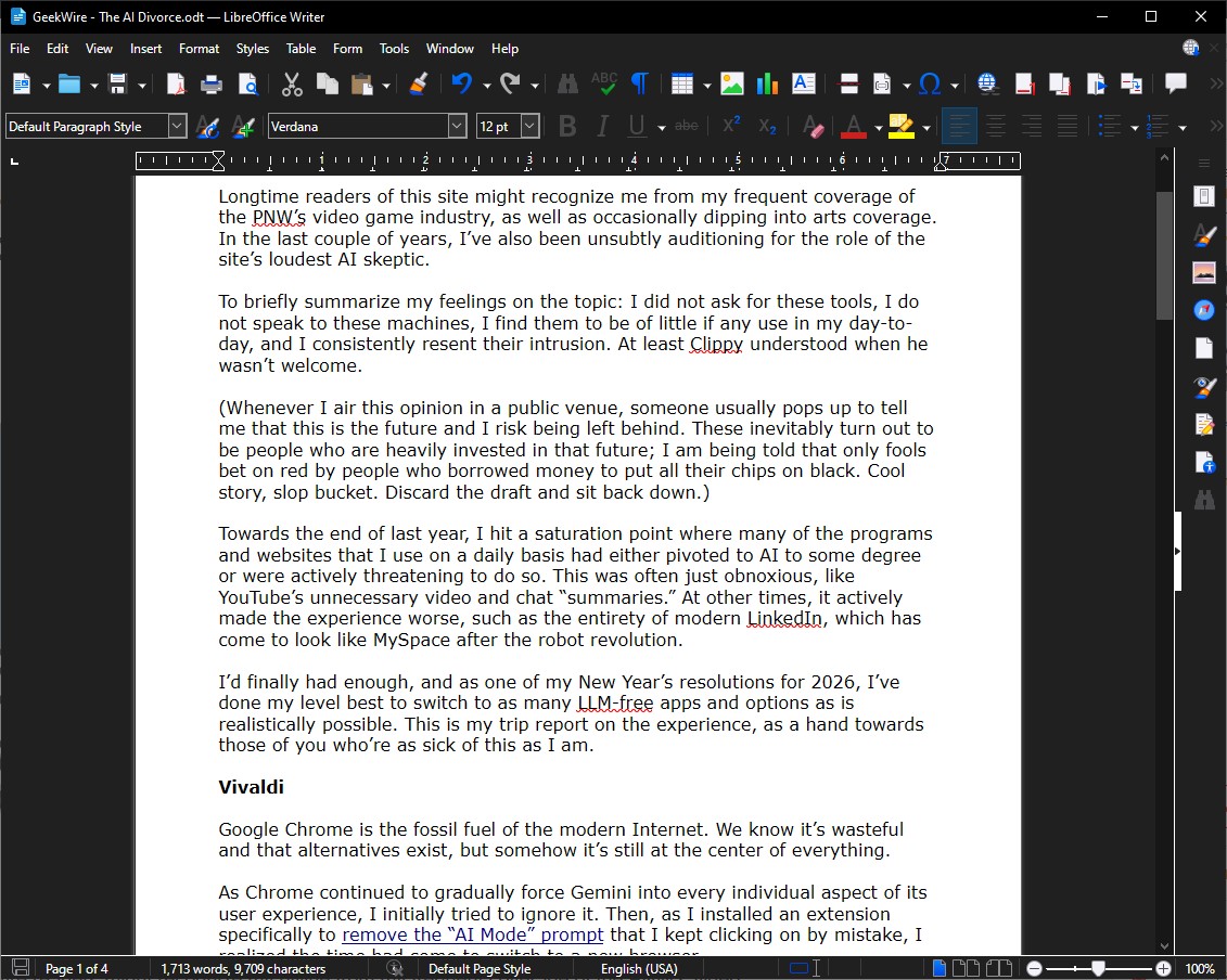 That got quietly ironed out at some point without my noticing. I’d reinstalled LibreOffice on a new computer, and over the course of using it, I noticed that all my previous problems simply no longer applied. It’s now a perfectly viable alternative for all my local word processing needs, and has been working almost flawlessly for the last couple of years. Almost every piece I write starts locally, with a blank LibreOffice document.