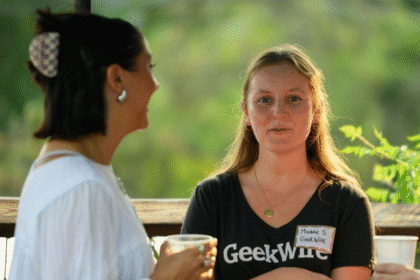 GeekWire intern Maddie Stoll, right, at the end-of-summer deck party with project…