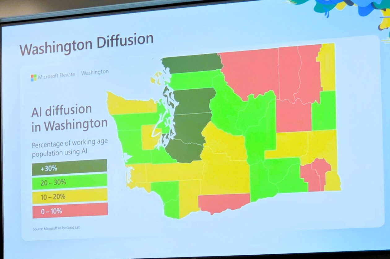 Broom pointed to a major gap in AI usage across the state, with more than 30% of the working-age population using AI in the Seattle region vs. less than 10% in some rural areas. Microsoft highlighted this divide when it launched the Elevate program last fall.