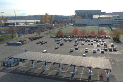 The new solar canopies and EV charging at a University of Washington parking lot alongside Husky Stadium. (Trinity Energy Photo)…
