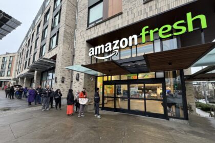 Shoppers line up outside Amazon Fresh at 23rd and Jackson in Seattle’s Central District on Thursday. (GeekWire Photo / Taylor…