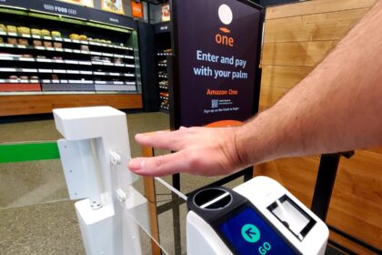 Entering an Amazon Go store in Seattle in 2020 by scanning a palm with Amazon One technology. (GeekWire File Photo…