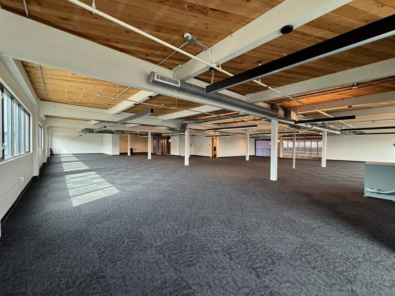 The new space features very high ceilings in the main manufacturing and warehouse space. Two stories of office space are being spruced up with the addition of meeting rooms and cubicles and other tech office trappings. One corner office with large windows looks down on the main floor.