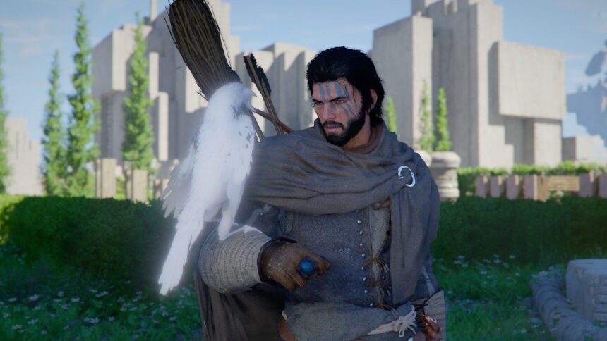After you help the villagers clean the chimney, you’ll start the Mystical Key quest. First off, you need to examine the Engraved Key you just got, so find it in your inventory, interact to bring it out, then hold CTRL (LB on controller) to have a look at it. Now, you need to enter Hernand Castle, so simply equip the Hernandian Attire you got from the last quest, and approach either gate.