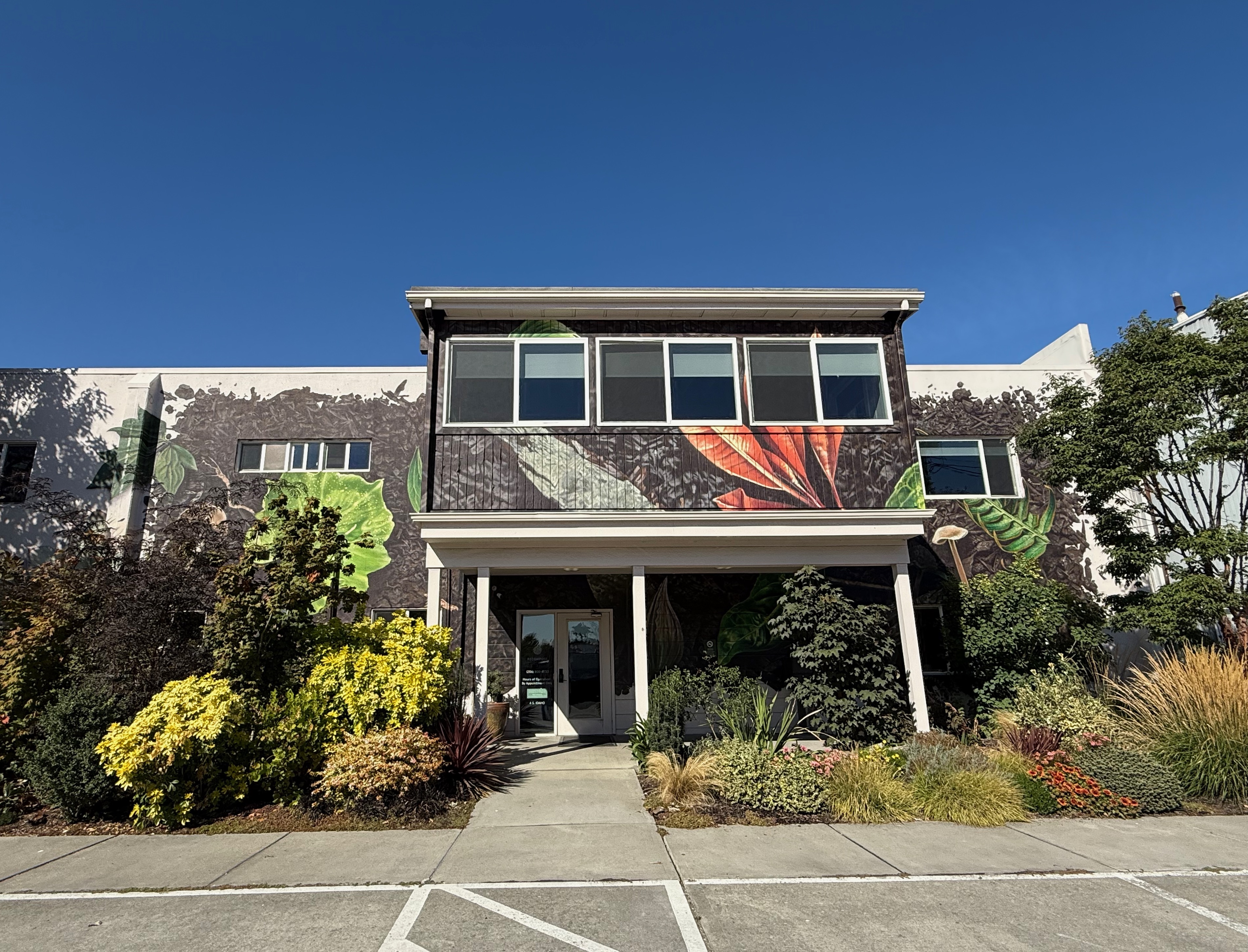 At the end of a busy, noisy street south of downtown Seattle, one building stands out from the warehouses and industrial businesses thanks mainly to its colorful mural and lush front garden full of trees, ornamental grasses and other plants.