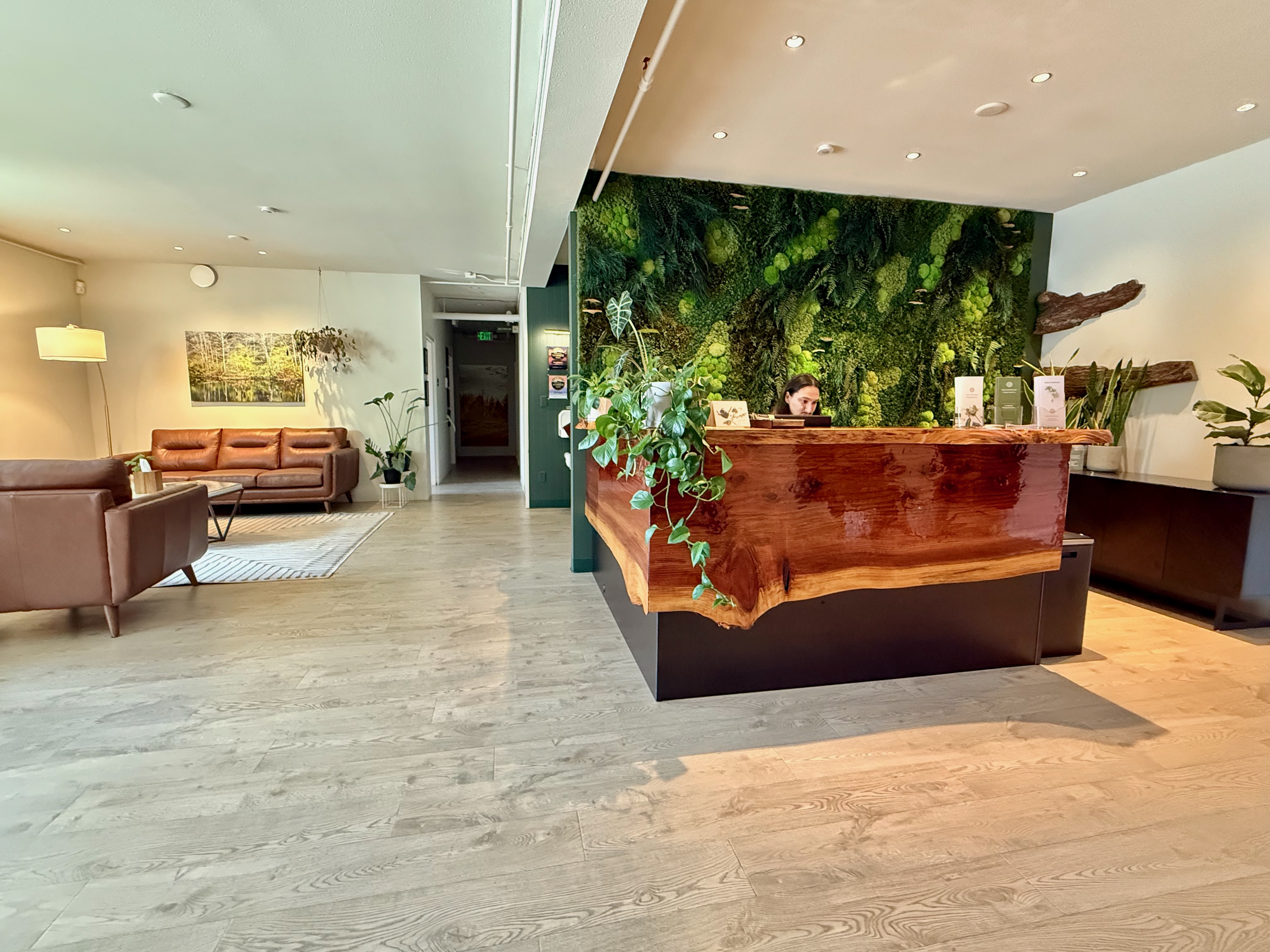 The front welcome area is thoughtfully designed and decorated with live-edge wood on the reception desk and an artful backdrop of preserved greenery. There are plants everywhere, free stickers that say, “Compost me when I die,” and assorted meeting rooms with names like Cedar and Moss.