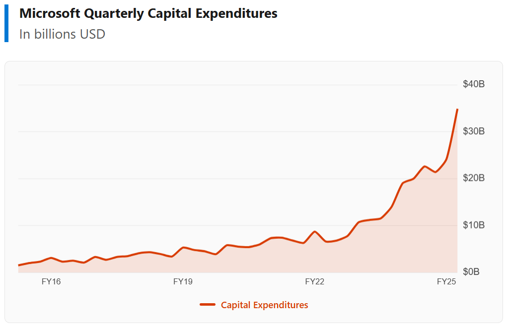 Microsoft has been spending big to keep up in the AI infrastructure race against Amazon, Google, and others. Its capital expenditures hit a record $34.9 billion in the fiscal first quarter alone, up from $24.2 billion in the prior quarter, as it moves quickly to build out data centers.