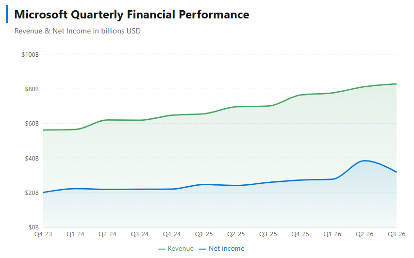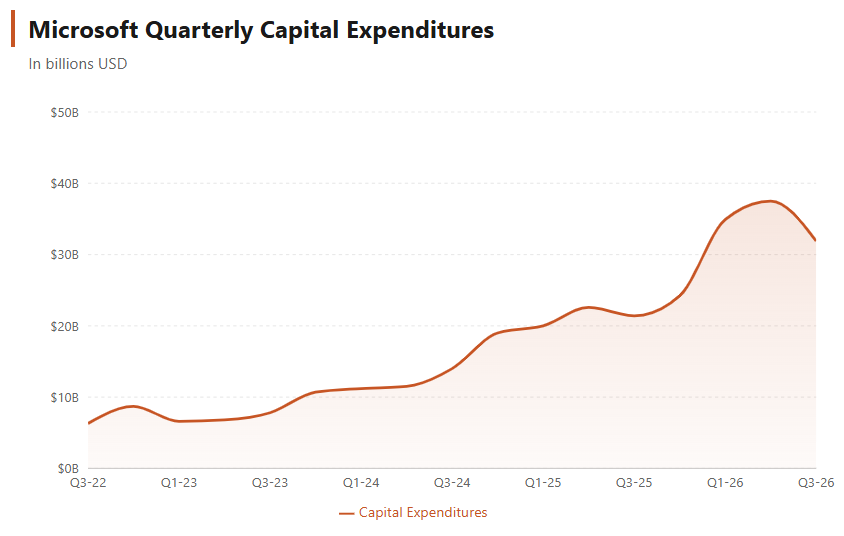 Capex trends: Capital spending came down to $31.9 billion from $37.5 billion the previous quarter. Microsoft had said the decline would come and that it reflected the timing of data center construction and hardware deliveries, not a slowdown in demand for cloud and AI services.