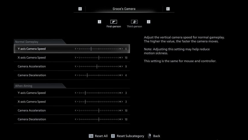 Capcom had to point it out themselves in a news announcement post-release: “Mouse sensitivity settings for each character can be changed via Camera in the Options menu. First, select Grace’s Camera or Leon’s Camera. Once selected, a menu with more detailed settings will open. From there, you can adjust the camera speed of first-person and third-person perspectives.”