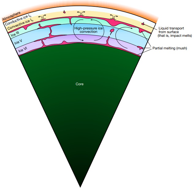 In contrast, the newly published research finds insufficient evidence for a liquid layer that large. Instead, it suggests that there’s an upper layer of low-pressure ice, roughly 106 miles (170 kilometers) thick, which transitions into a 235-mile-thick (378-kilometer-thick) layer of high-pressure ice.