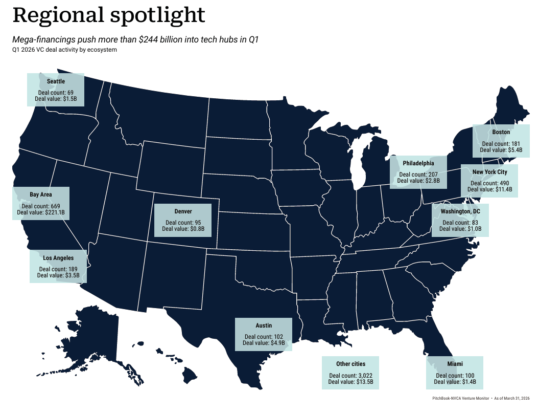 It’s a pattern that is also playing out nationally. U.S. startups raised $267 billion in Q1, more than double the prior record, but five deals — including rounds by OpenAI, Anthropic, and xAI — accounted for nearly three-quarters of that total.