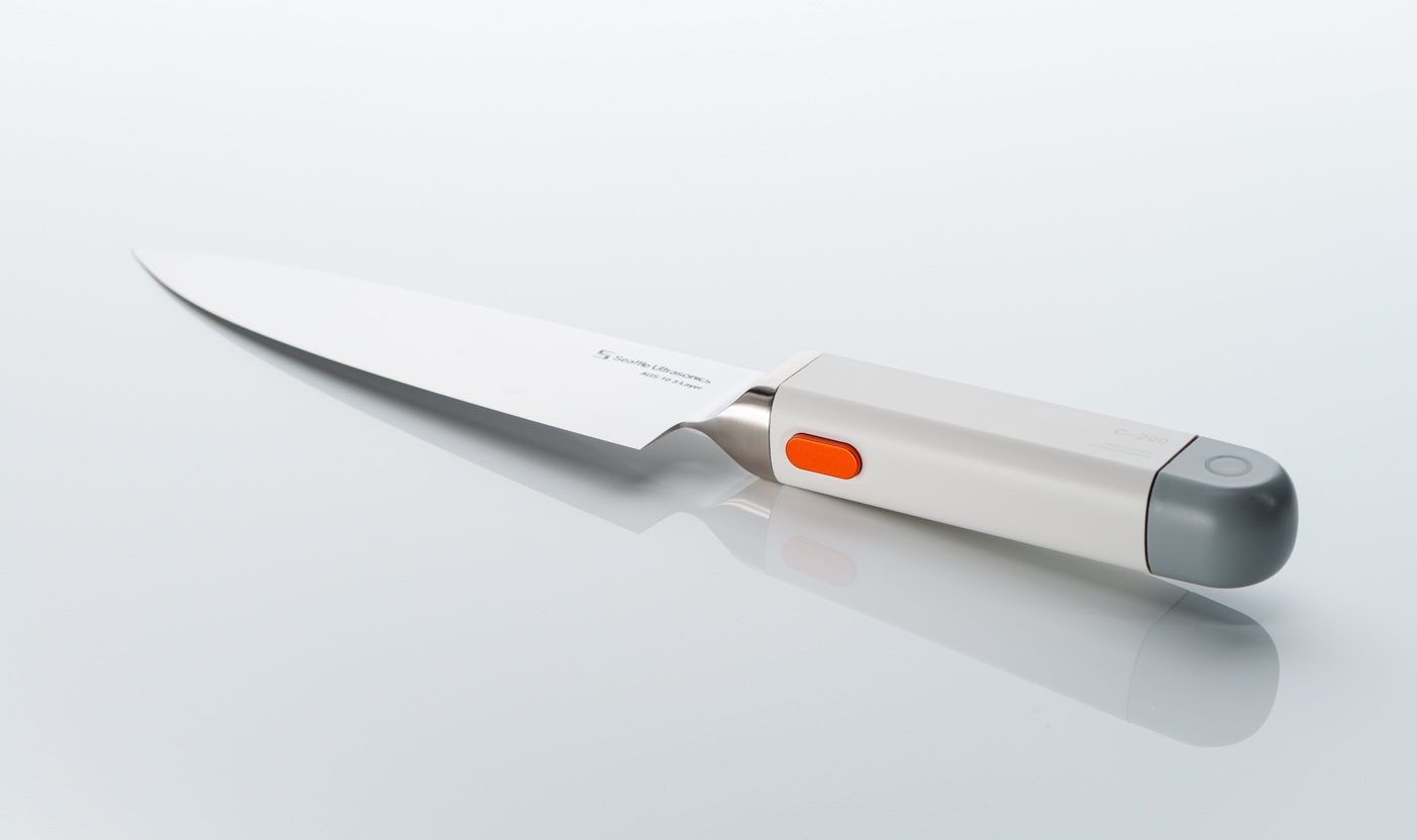 Heimendinger ultimately found, thanks to perfecting the blade vibrations facilitated by the handle’s piezoelectric crystals, that the ultrasonic knife requires less downward force to glide through a tomato or carrot or loaf of bread or any other food item.