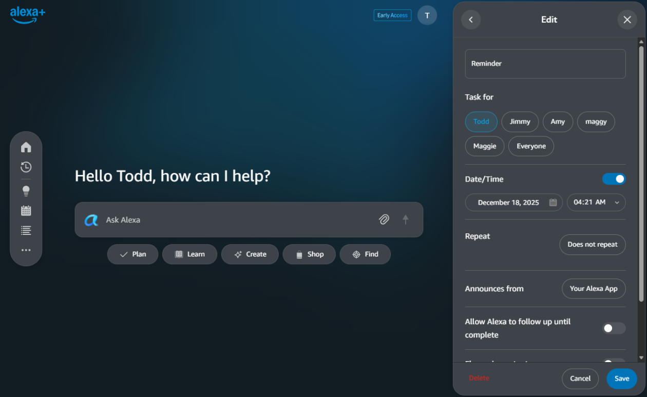 For example, I was able to edit a family reminder: changing the assigned person, adjusting the date and time, setting it to repeat weekly, and adding a flag for Alexa to follow up until it’s complete. All of this happened through simple clicks, much easier than talking Alexa through the details, in my experience.